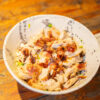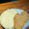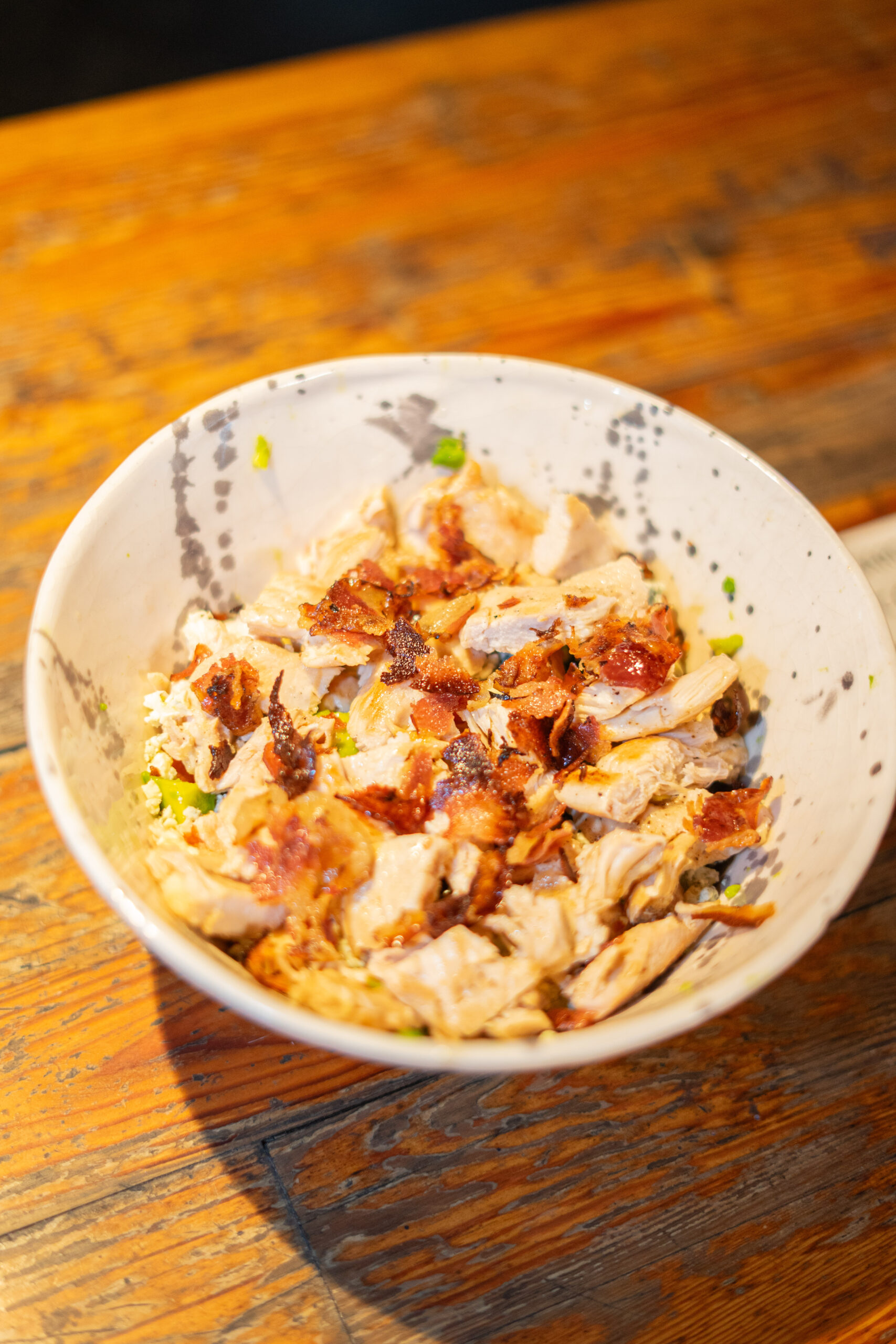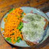 Pollo desmechado, con pasta a base de: huevo duro, cebolla, tomate, palta, yogur griego, limón, sal, pimienta