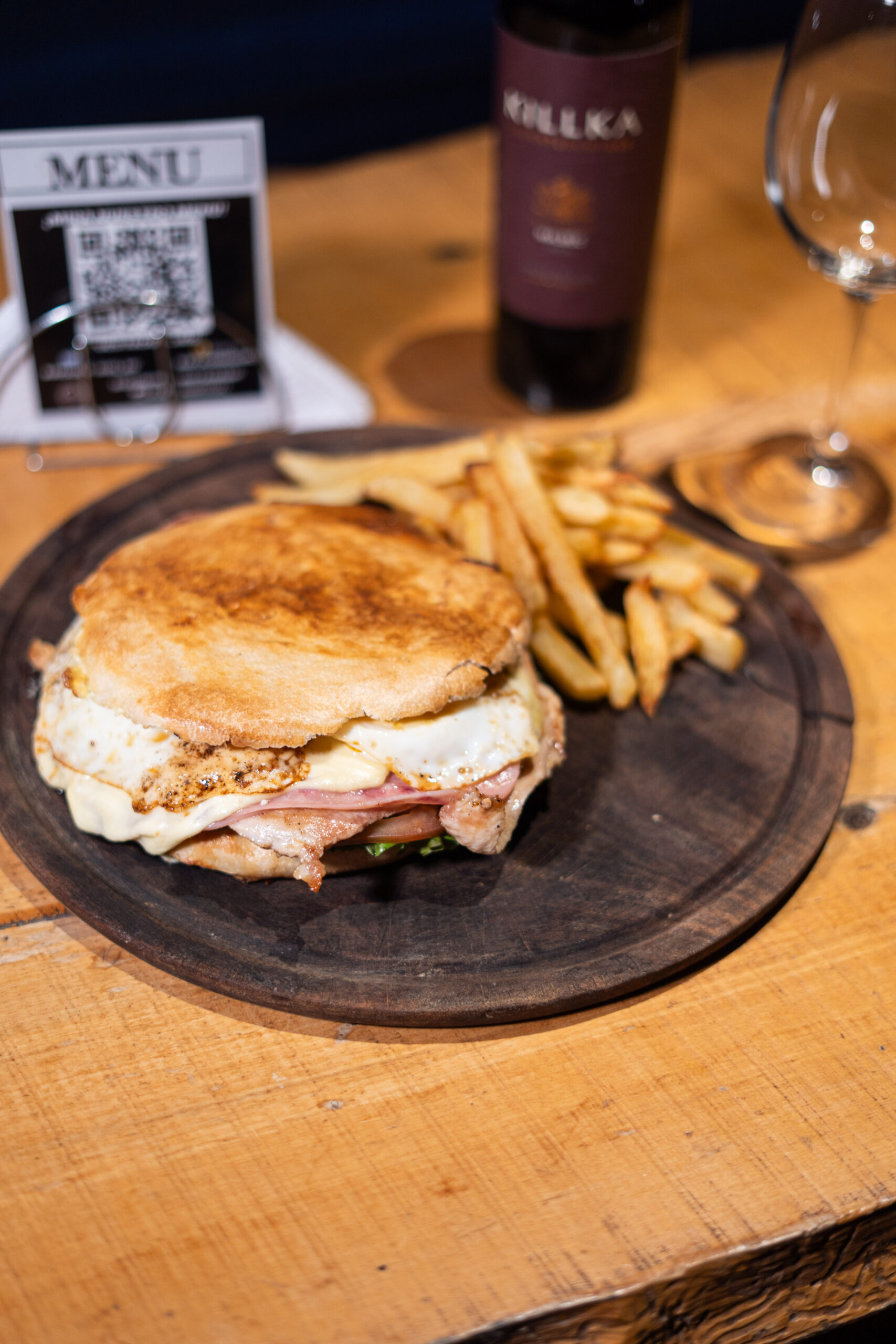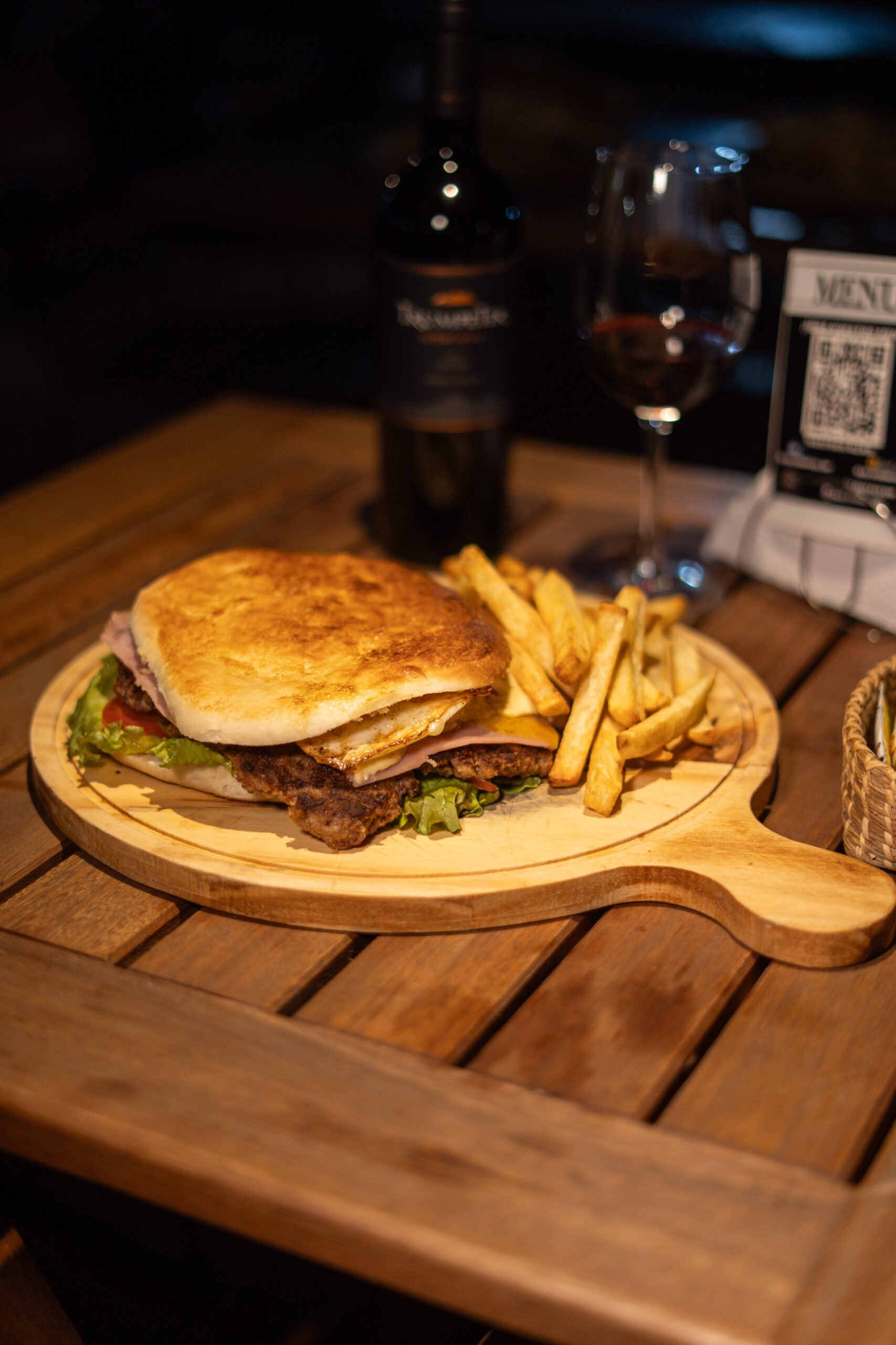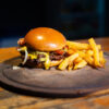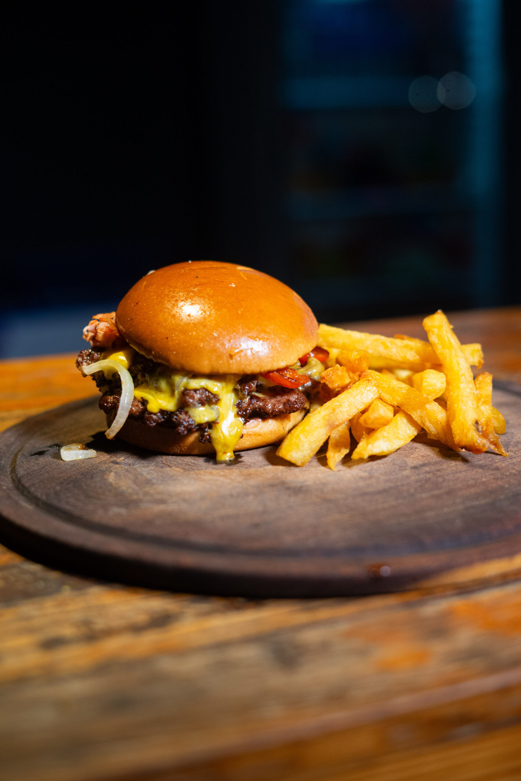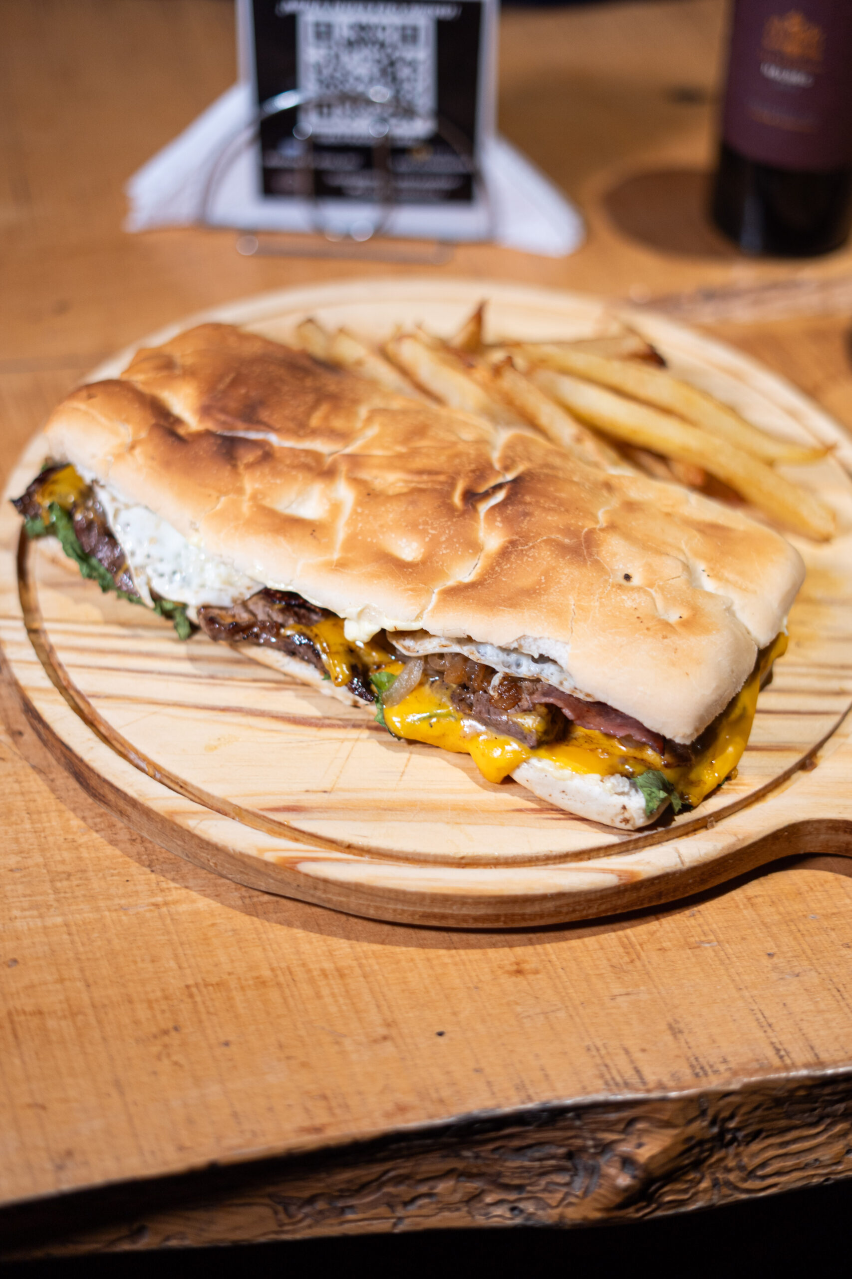 ( Pan brioche, doble carne, doble cheddar, cebolla, mayochimi, papas fritas )