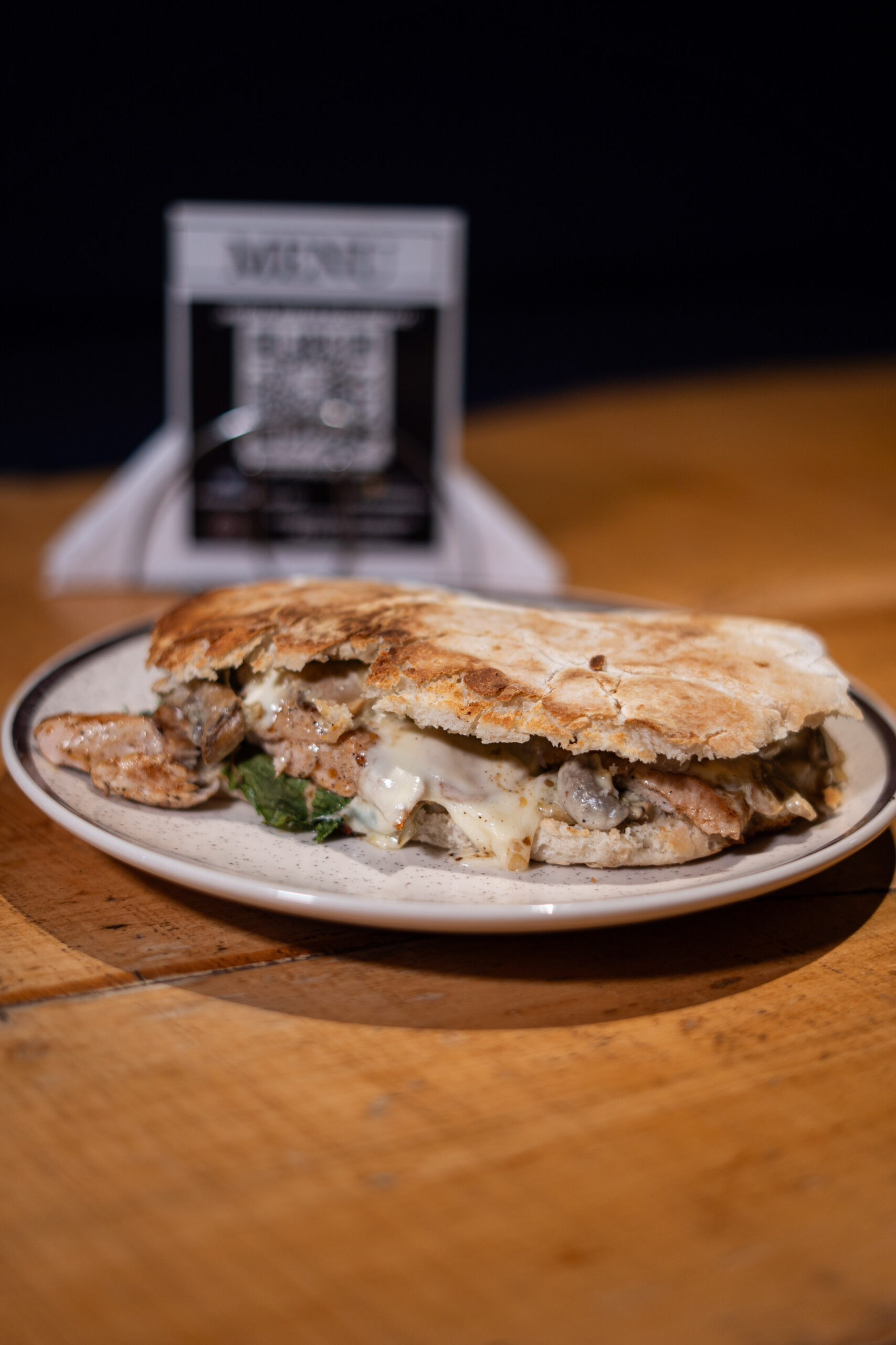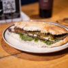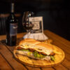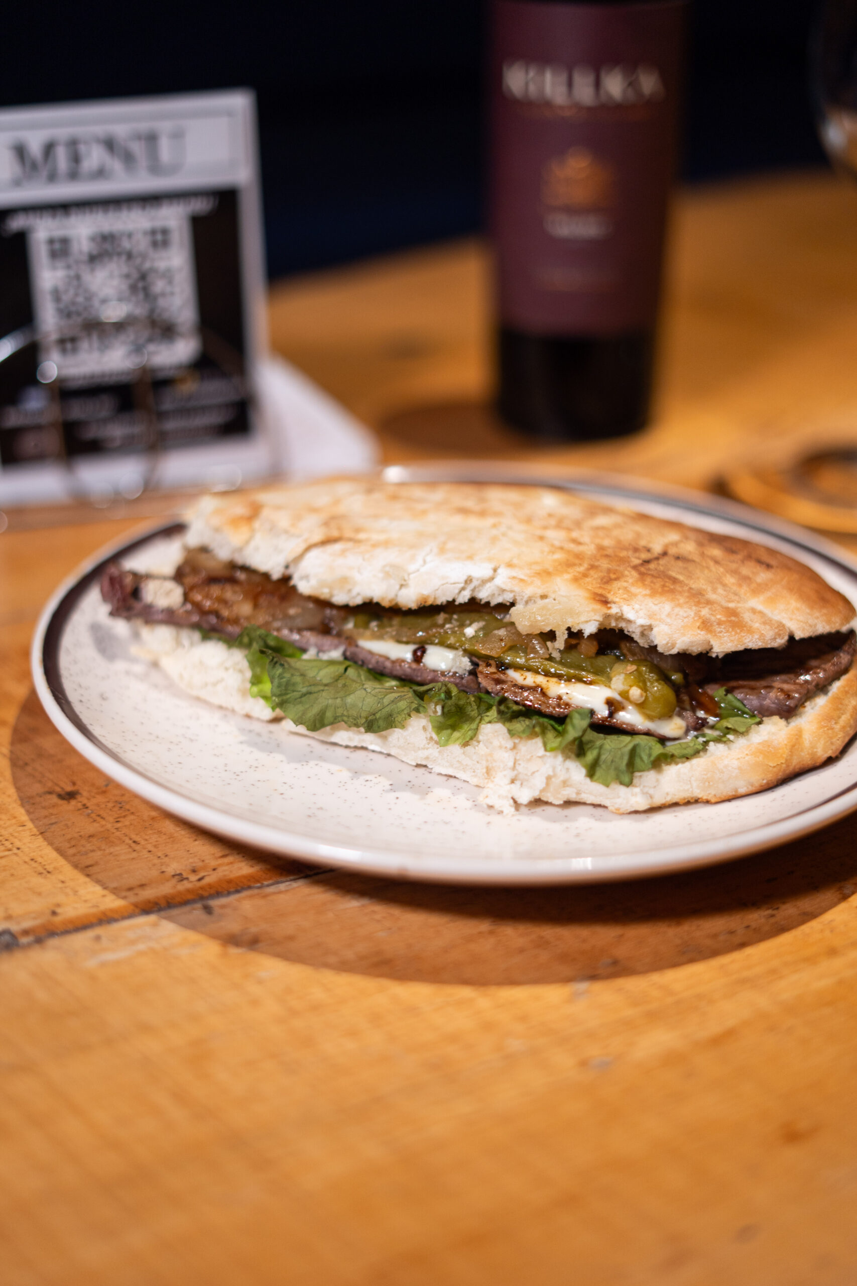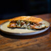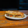 Lomito con queso gratinado, cebolla caramelizada, morrones asados, lechuga, mayonesa. Pan untado a base de: ajo, perejil, manteca