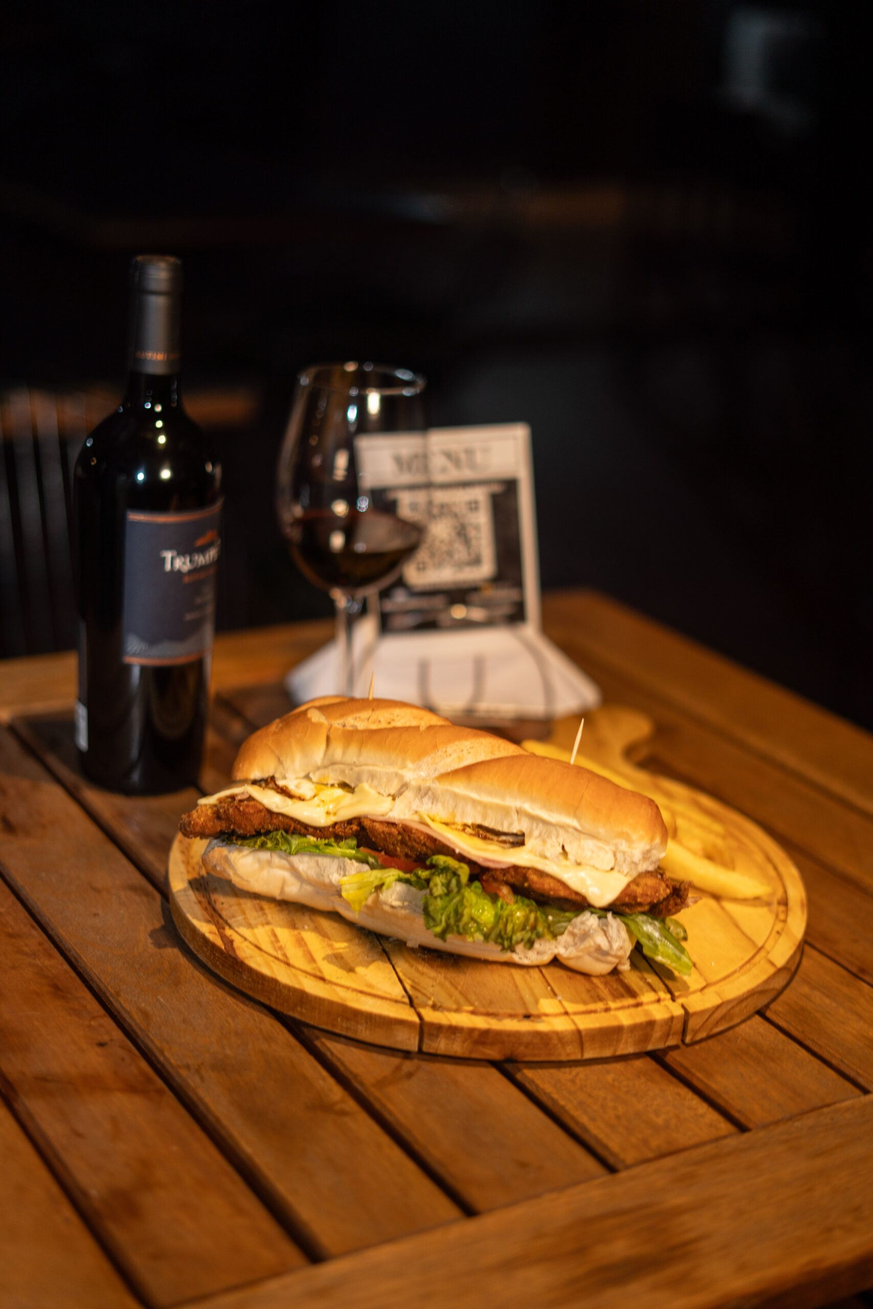 Pan casero, Pechuga de pollo grillada, queso cremoso, jamón, tomate, lechuga, huevo, mayonesa, papas fritas, 1 salsa