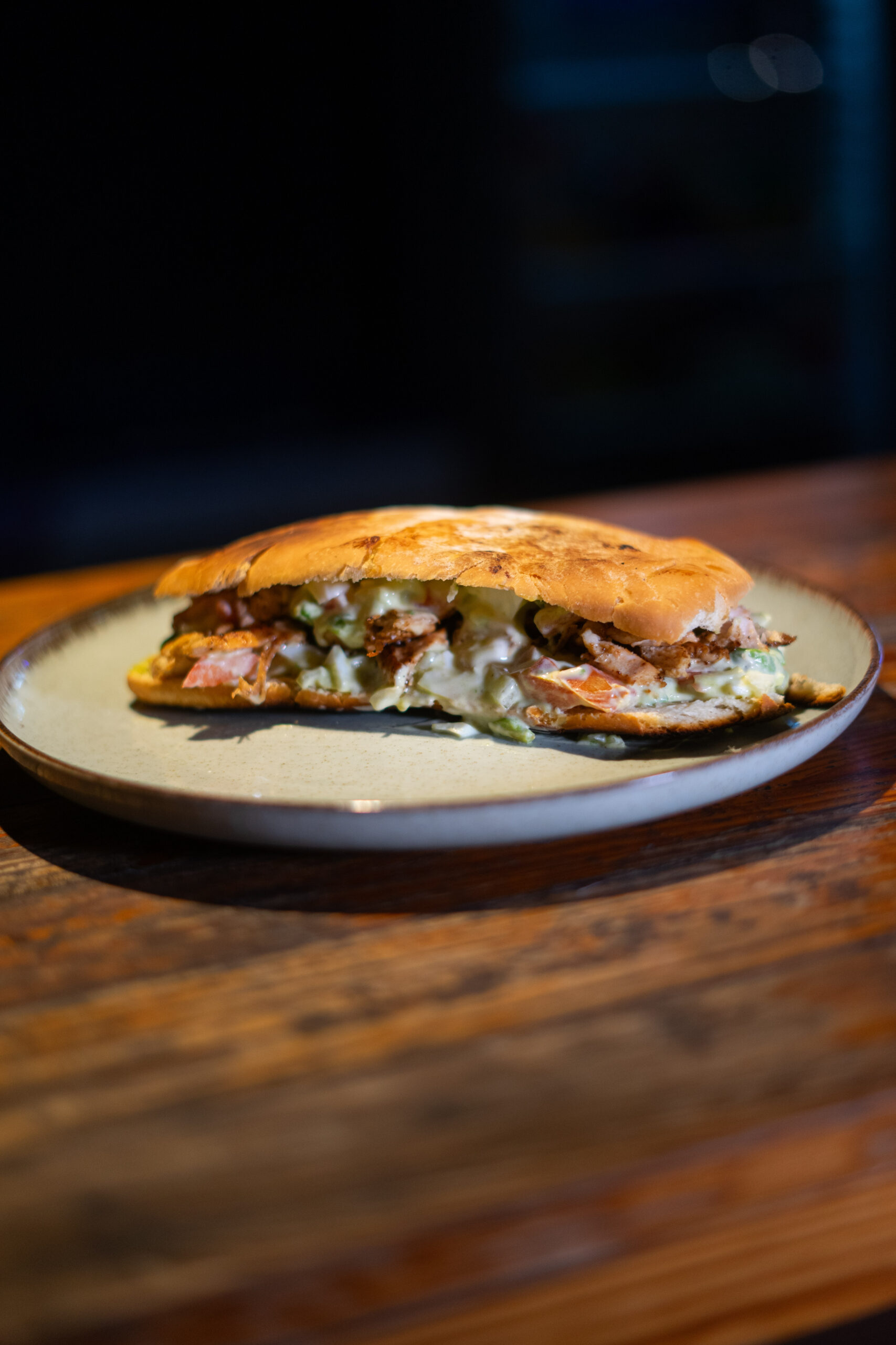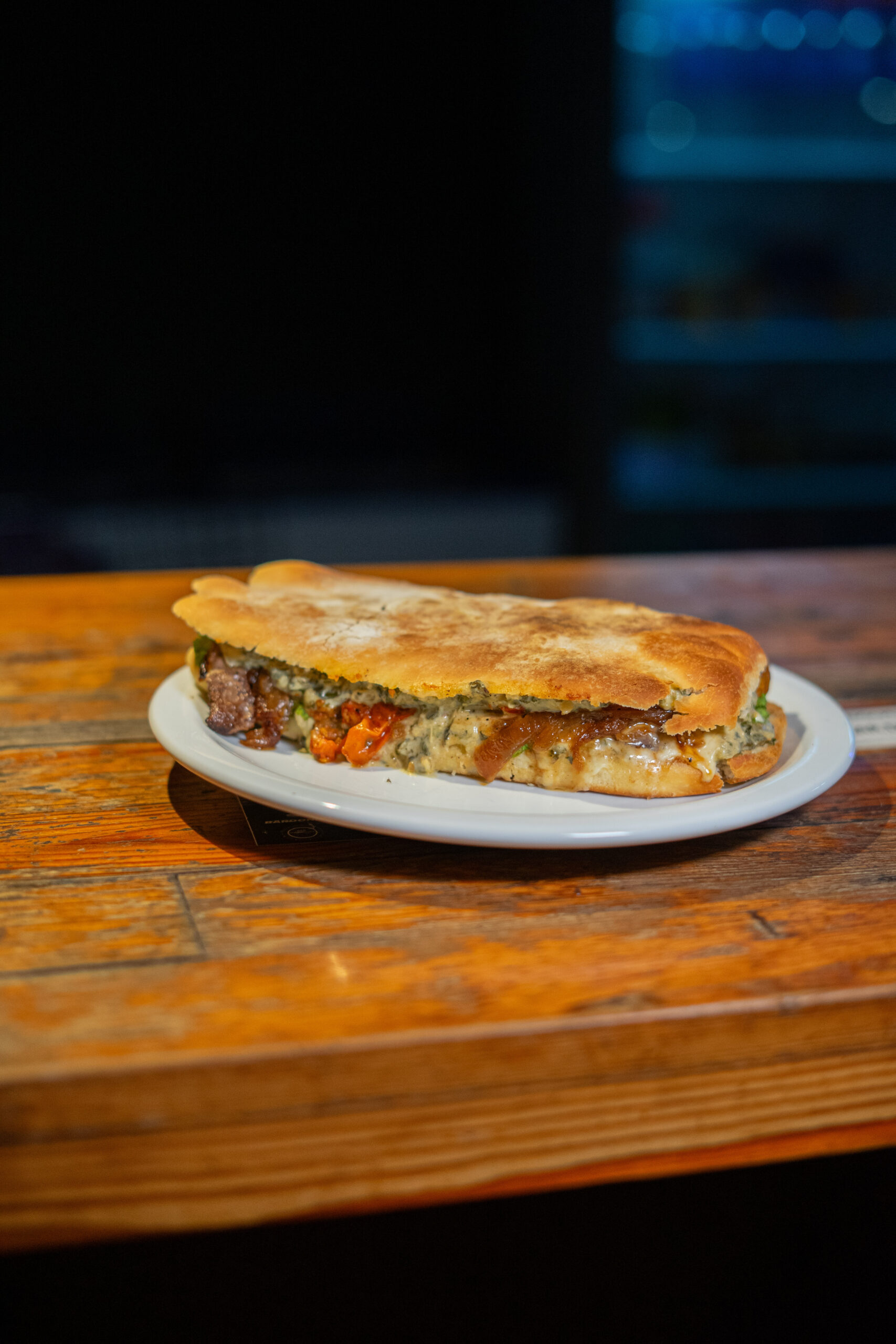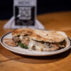 Lomito, salsa de espinaca salteada con queso crema, cebolla caramelizada, tomates cherrys asados, morrones asados, lechuga