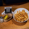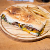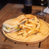 Estilo americanas - Pan brioche, medallón de lentejas gratinada, champiñones salteados con queso crema, tomates asados, lechuga, cebolla morada, mayonesa, papas fritas