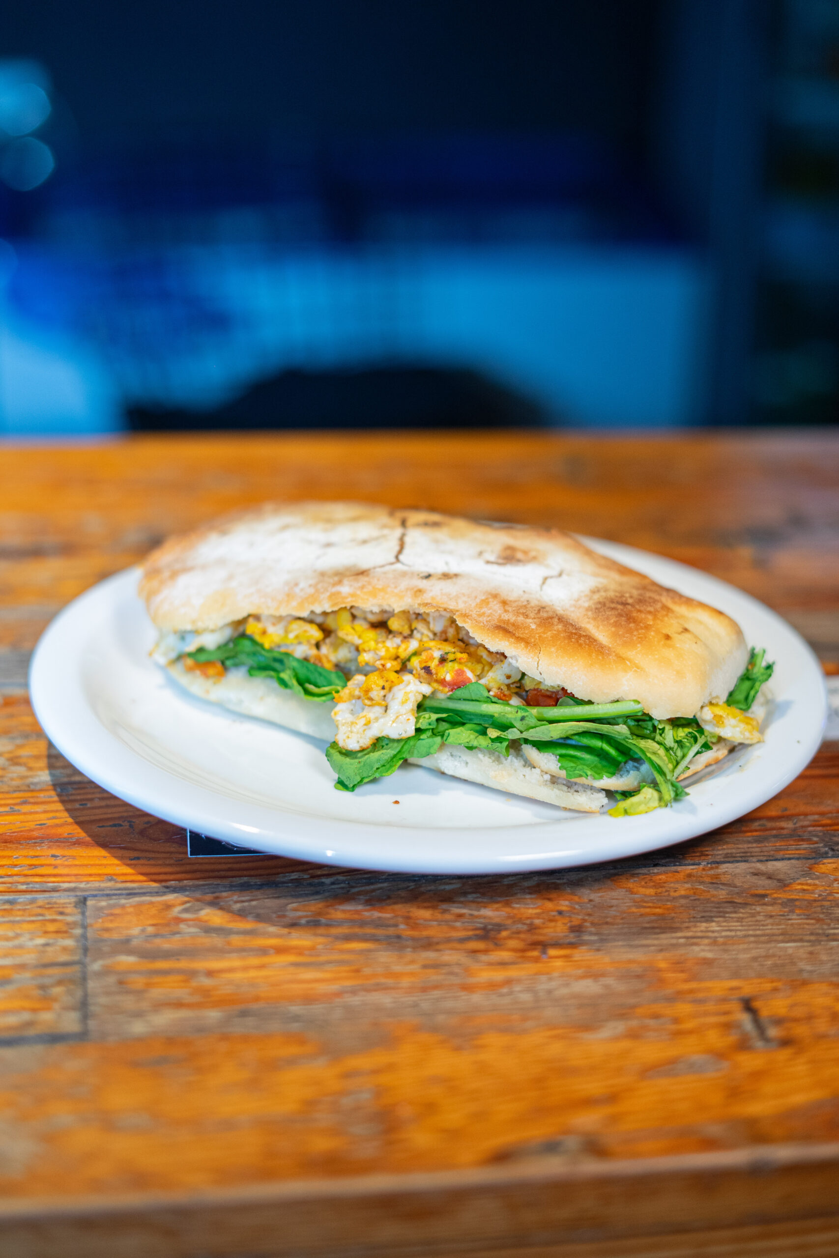Huevo revuelto con cebollita de verdeo, tomate cherry asado, rúcula y queso parmesano, mayonesa