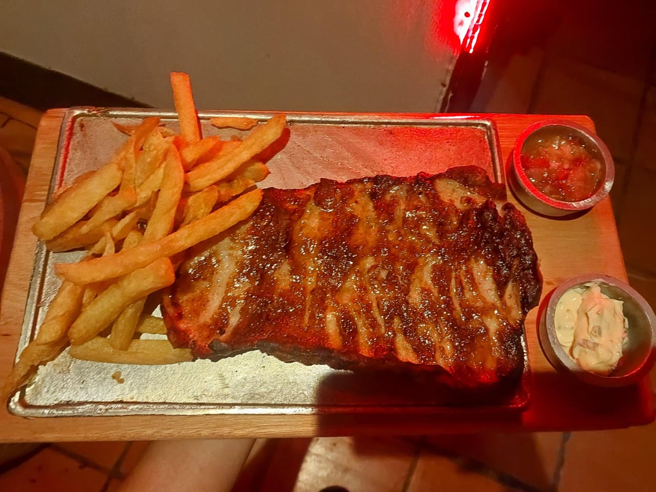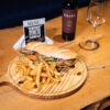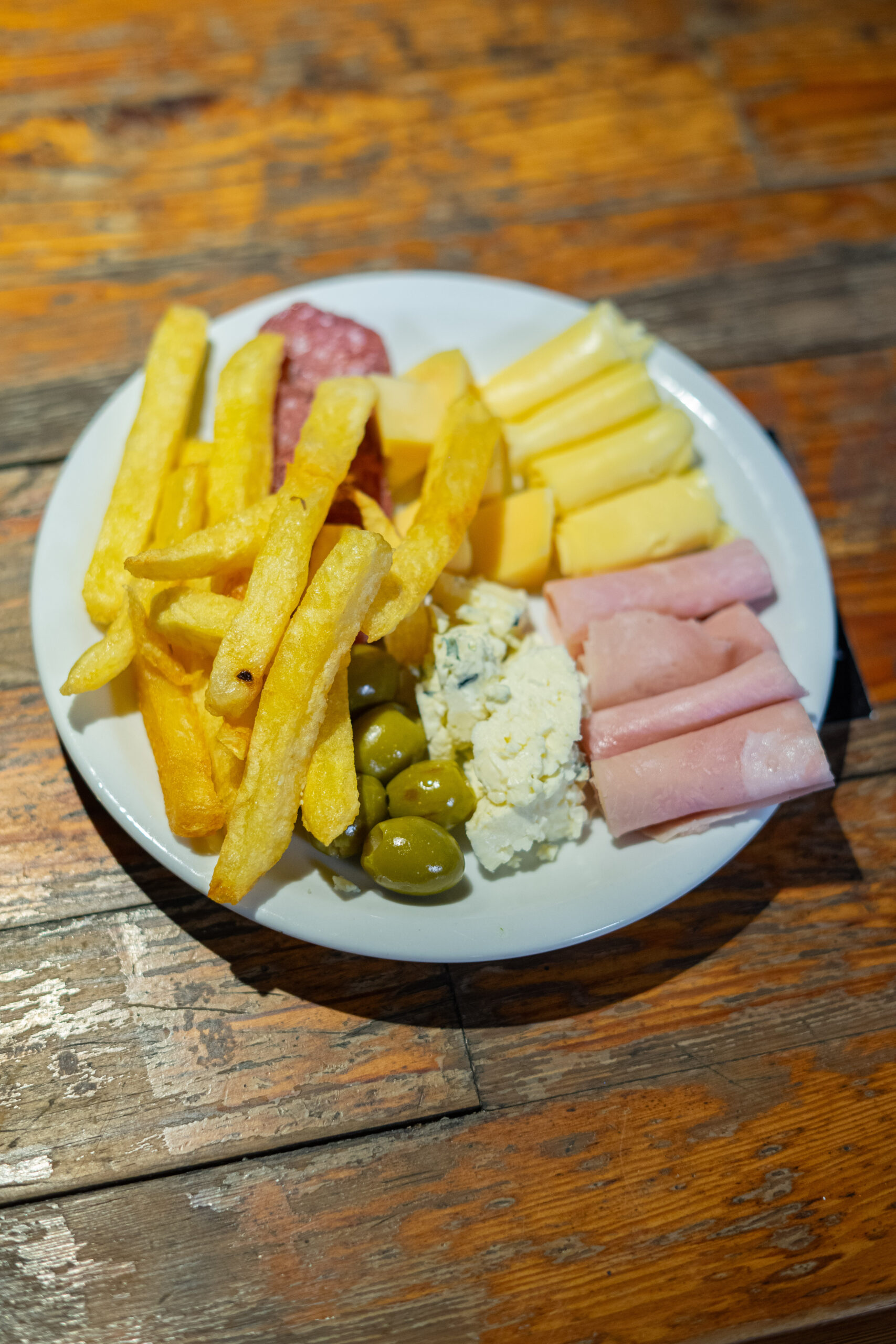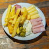 Queso roquefort, queso barra, queso pategras, salamin, salame milán, jamón cocido, bondiola, milanesa, papas fritas , 3 salsas a elección, pan , aceitunas